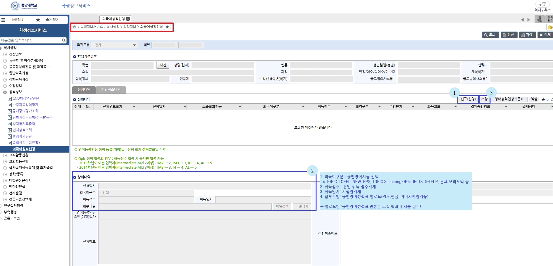 다. 제출프로세스 ※ 외국어성적신청(학생): (통합) 학생정보시스템→학사행정→성적정보→외국어성적신청(붙임3참조) 외국어성적신청(학과): (통합) 학사행정→성적관리→외국어성척→외국어성적학과승인 |